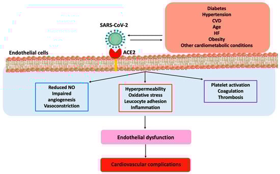There is a bidirectional pathophysiologic relationship between Coronavirus Disease 2019 (COVID-19) and cardiometabolic diseases [,]. A large body of evidence has shown that patients with cardiometabolic conditions, in particular obesity, hypertension, diabetes mellitus, and heart failure, present an increased risk for severe forms of COVID-19 associated with a high rate of death [,]. It has been estimated that nearly 63.5% of hospitalizations for severe COVID-19 were attributable to the coexistence of cardiometabolic conditions []. On the other hand, patients with severe COVID-19 infection are more prone to develop cardiovascular complications [,]. In such a context, endothelial dysfunction plays an important role in the development of severe COVID-19 disease after SARS-CoV-2 infection. Indeed, although SARS-CoV-2 infection primary involves the respiratory system, endothelial damage has been described as a hallmark of cardiovascular complications, particularly in dysmetabolic patients []. The damage of endothelium in COVID-19 consists of endotheliopathy and endotheliitis, causing a proinflammatory and procoagulant state [] (Figure 2).