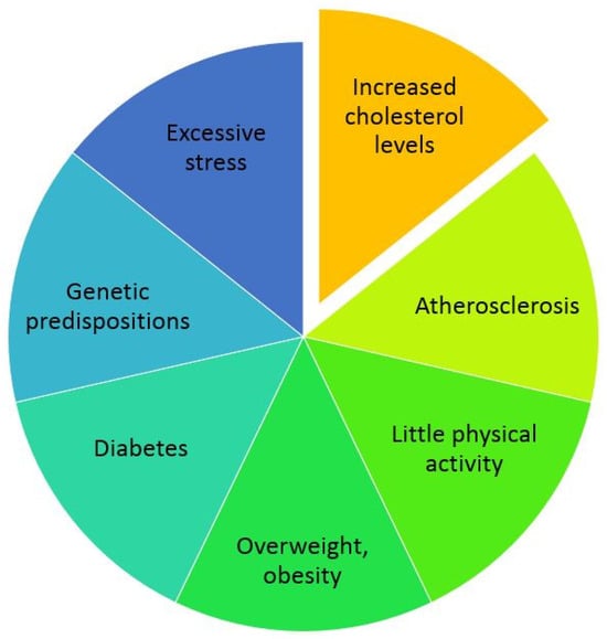 Risk factors for cardiovascular diseases include the following: genetic predispositions (early—in men under 55 years of age, in women under 60 years of age—family history of ischemic heart disease or atherosclerosis-related diseases of other arteries), age (men from 45 years of age, women from 55 years of age), gender (higher risk in men than in premenopausal women), little physical activity, increased blood pressure, increased concentration of LDL cholesterol (LDL-C) in the plasma, increased triglyceride (TG) levels, pre-diabetes or diabetes, overweight and obesity (Figure 1) []. Other diseases, e.g., of the lungs and kidneys, may also influence the occurrence and course of cardiovascular diseases [].