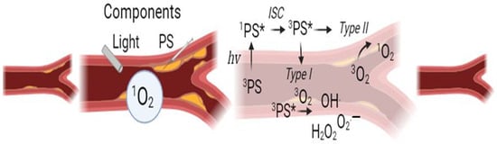 PDT is a new, promising therapeutic method for atherosclerosis []. Its use requires three ingredients: photosensitizers (PS), light with the appropriate wavelength to activate PS and tissue oxygen []. The photosensitizer specifically accumulates in the cell and can enter various cellular organelles such as mitochondria, lysosomes, endoplasmic reticulum, Golgi apparatus and plasma membranes []. Then, under the influence of light, reactive oxygen species (ROS) are produced, which oxidize cellular components to induce apoptosis []. The course of the entire process depends on the type of cell, the photosensitizing agent and its cellular location, as well as the dose of light []. Figure 2 shows mechanism of PDT.