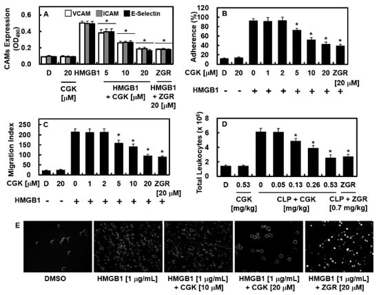 2.4. Effects of CGK012 on HMGB1-Mediated Expression of CAMs, Adhesion of Neutrophils, and Migration of Leukocytes