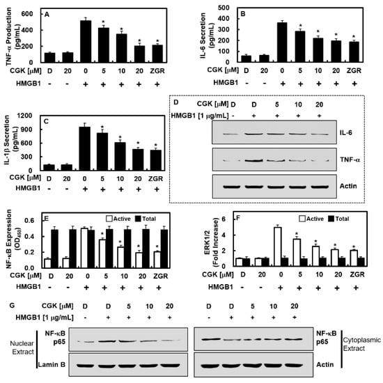 2.5. CGK012 Suppresses NF-κB/ERK Signaling and IL-1β, IL-6, and TNF-α Production