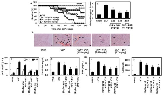 - Lee, B.S.; Lee, C.; Yang, S.; Ku, S.K.; Bae, J.S. Renal protective effects of zingerone in a mouse model of sepsis. BMB Rep. 2019, 52, 271–276. [Google Scholar] [CrossRef]