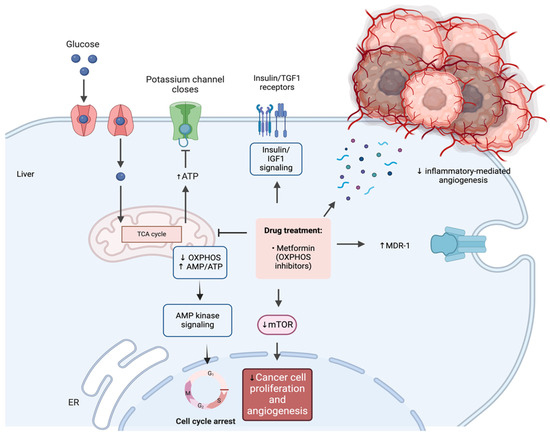 Metformin inhibits cancer through direct and indirect pathways, impacting multiple molecular mechanisms [18]. The activation of AMPK plays a crucial role, inhibiting cellular proliferation and inducing G1-phase cell cycle arrest [24]. Metformin also activates the multidrug resistance 1 (MDR1) gene, potentially reducing drug failure in chemotherapy [25]. Additionally, it inhibits lipogenic enzymes, leading to reduced fatty acid availability for tumor cells. The inhibition of the mammalian target of rapamycin (mTOR) pathway by metformin suppresses cancer progression and angiogenesis [26]. Metformin influences insulin and insulin-like growth factors (IGFs), reducing plasma insulin and IGF-1 levels, known mitogen for cancer cells [27]. Other signaling pathways affected include Ras/Raf/mitogen-activated protein kinase (MAPK) [28], nuclear factor kappa B (NF-kB) [29], and human epidermal growth factor receptor-2 (HER2) [30]. Metformin exhibits anti-angiogenic effects by attenuating pro-angiogenic inflammatory stimuli [31]. It may inhibit cancer stem cells, improve chemotherapy response, stimulate cytotoxic T lymphocytes, and suppress DNA damage, contributing to its overall anti-cancer properties [18]. The above are illustrated in brief in Figure 1.