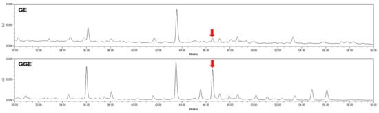To validate and determine the differences in the chemical components between GGE and GE, a high-performance liquid chromatography (HPLC) analysis was conducted. Briefly, powdered GE and GGE samples were dissolved in 80% methanol to obtain 10,000 ppm solutions. Both solutions were passed through a 0.22 μm membrane filter (Woongki Science Co., Ltd., Seoul, Republic of Korea); then, 10 μL of the filtrate was injected into a Waters 600S HPLC system (Waters, Milford, MA, USA) equipped with a Waters 2487 UV detector (280 nm). A 250 × 4.6 mm Shimpack Gist column with a particle size of 3 μm was used (Shimadzu Co., Kyoto, Japan). The mobile phase (0.1% formic acid in H2O, solvent A; acetonitrile, solvent B) was eluted with the following elution gradient of B: 30% (0.01 min) → 30% (5 min) → 55% (10 min) → 55% (13 min) → 80% (25 min) → 80% (30 min) → 100% (60 min). Triplicate samples were quantified using instrument-embedded software.