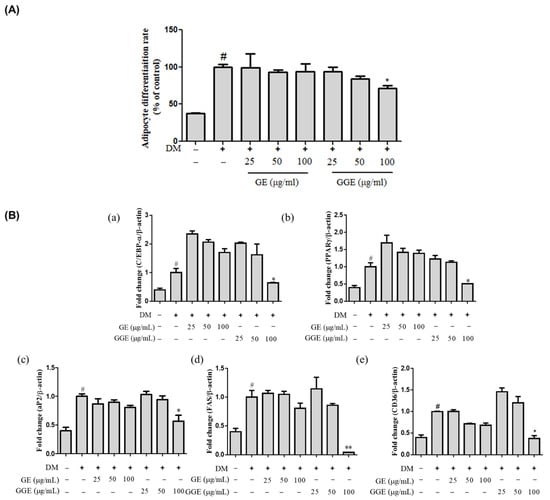 Inhibitory effects of GE and GGE on adipocyte differentiation. (A) Adipocyte differentiation inhibition rates (%) of GE and GGE in 3T3-L1 cells. (B) Inhibitory effects of GE and GGE on the mRNA expression levels of adipogenesis-associated genes. (a) C/EBP-α, (b) PPARγ, (c) aP2, (d) FAS, and (e) CD36. Data are expressed as a percentage of differentiation control and are mean ± SD (n = 4). # p < 0.05 vs. untreated control. * p < 0.05, ** p < 0.01 vs. differentiation control. aP2, adipocyte protein 2; C/EBP-α, CCAAT/enhancer binding protein; CD36, cluster of differentiation 36; DM, adipocyte differentiation medium; FAS, fatty acid synthase; GE, EtOH extract of fresh ginger; GGE, EtOH extract of golden ginger, which is steam-processed ginger; PPARγ, peroxisome proliferator activated receptor γ.