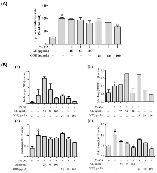 We investigated the ability of GGE and GE to suppress lipid accumulation in HepG2 cells (Figure 3A). The exposure of HepG2 cells to 5% oleic acid resulted in the doubling of lipid accumulation (p < 0.05). GE at a given dose was not effective at suppressing lipid accumulation in HepG2 cells compared to the 5% oleic acid control. In contrast, treatment with GGE at 100 μg/mL resulted in a significant reduction in lipid accumulation (p < 0.01). Based on these results (Figure 3A), we examined the expressions of four genes related to intracellular fatty acid synthesis, namely LXR, SREBP, ACC, and FAS, using qRT-PCR (Figure 3B). In HepG2 cells, 5% oleic acid treatment increased the mRNA expression levels of SREBP, ACC, and FAS significantly (p < 0.05), but not that of LXR (Figure 3B). GE treatment at 100 μg/mL resulted in a remarkable decrease in the mRNA expression levels of SREBP and FAS. The oleic acid-induced increase in the mRNA expression levels of LXR, SREBP, ACC, and FAS genes was strongly suppressed by GGE in a dose-dependent manner. As shown in Figure 3B-(d), GGE at a concentration of 100 μg/mL significantly decreases the 5% oleic acid-induced increase in expression of the FAS gene (p < 0.05). This potent inhibitory effect of GGE on FAS gene expression can contribute to the suppression of lipid accumulation in HepG2 cells.
