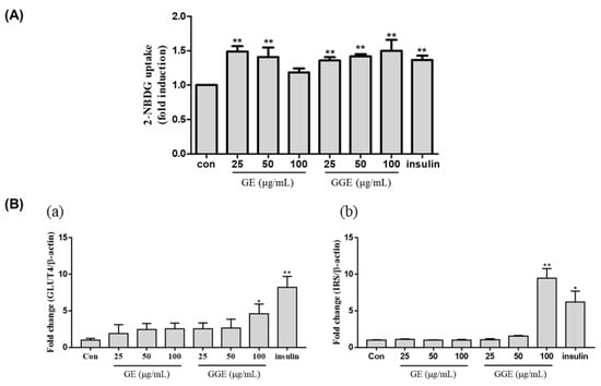 To evaluate the ability of GGE to improve the glucose uptake rate, C2C12 cells were fully differentiated, and then the uptake rates of 2-NDBG into cells were determined in the presence or absence of GE and GGE. Insulin treatment resulted in a significant increase in glucose uptake (Figure 4A). GE treatment at a given dose significantly increased glucose uptake in the absence of insulin (p < 0.01), but its potency was inversely related to the dose. GGE treatment increased the uptake of glucose significantly in a dose-dependent manner (p < 0.01). These results suggest that GGE stimulates glucose uptake more predictably than GE.