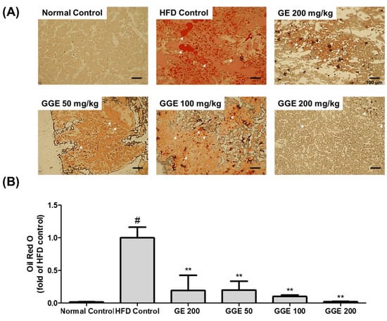 An excessive intake of fat causes the accumulation of fat in the liver, leading to NAFLD. HFD-fed mice showed a significant increase in NEFA, T-C, and LDL-C levels in the blood (Table 4). We therefore performed oil-red O staining of cross-sections of liver tissue to investigate the effects of GGE on fat accumulation in the liver. As shown in Figure 5, HFD-fed mice showed a significant accumulation of fat in the liver compared with the normal-diet control mice (p < 0.05). GE supplementation at a dose of 200 mg/kg significantly reduced fat accumulation in the liver (p < 0.01). GGE supplementation also significantly suppressed fat accumulation in the liver in a dose-dependent manner (p < 0.01). The suppressive effect of GGE on fat accumulation in the liver is higher than that of GE because GGE at 50 mg/kg has a similar suppressive effect to that of GE at 200 mg/kg (Figure 5).