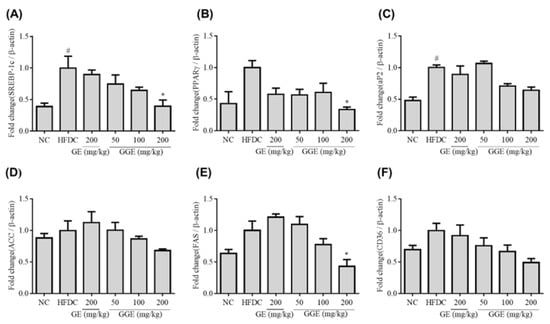 To further characterize the mechanism by which GE and GGE suppressed fat accumulation in the liver, the mRNA expression levels of SREBP-1c, PPAR-r, aP2, ACC, FAS, and CD36 were measured using qRT-PCR (Figure 6). The expression of these six genes in HFD-fed mice increased compared to the normal-diet control mice, but only the increase in transcript levels of SREBP-1c and aP2 was statistically significant (p < 0.05). GE supplementation (200 mg/kg) decreased the mRNA expression levels of these six genes, but without statistical significance. GGE supplementation decreased the mRNA levels of these six genes. In particular, GGE at 200 mg/kg caused a significant decrease in SREBP-1c, PPAR-γ, and FAS gene expression levels (Figure 6). These results suggest that GGE supplementation can suppress fat accumulation in the liver by downregulating the gene expression levels of SREBP-1c, PPAR-γ, and FAS. Fat accumulation in the liver can cause liver damage. As shown in Table 4, GOT and GPT levels are significantly increased along with excessive fat accumulation in the liver of HFD-fed mice (Figure 5). GGE supplementation had more potent suppressive effects on high-fat-associated liver damage and fat accumulation than GE.