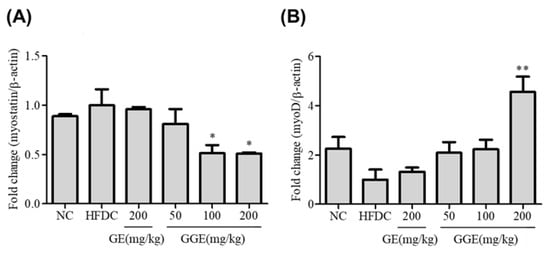 HFD-fed mice showed an increased mRNA expression of myostatin, whereas the expression of myoD was decreased but without statistical significance (Figure 7). GE supplementation (200 mg/kg) of HFD-fed mice did not correct the HFD-mediated changes in the expression of these two genes in muscle tissue. However, GGE supplementation reversed the HFD-mediated changes in the expression of these two genes. These effects of GGE were significant at a dose of 200 mg/kg.