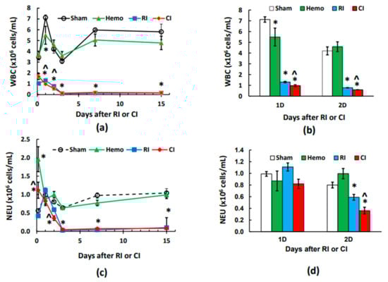 Effects of radiation alone or combined radiation injury with hemorrhage on white blood cells and neutrophils. Animals were exposed to 8.75 Gy alone or followed by 20% hemorrhage. Complete blood cells were counted in blood collected in sham mice, Hemo alone mice, radiation alone mice, or radiation + Hemo mice at 4–5 h and on days 1, 2, 3, 7, and 15. Data are mean ± sem with N = 6 per group per time point. (a) WBC throughout 15 days; (b) WBCs on day 1 and day 2; (c) neutrophils throughout 15 days; (d) neutrophils on day 1 and day 2. * p < 0.05 vs. sham group; ^ p < 0.05 vs. sham, Hemo, and RI at the specific time point. Hemo: 20% hemorrhage; RI: 8.75 Gy; CI: 8.75 Gy + 20% hemorrhage; WBC: white blood cells; NEU: neutrophils; D: day.