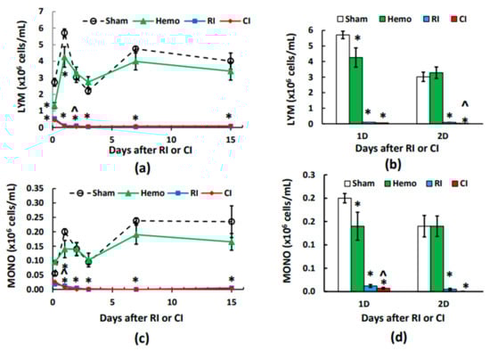 Effects of radiation alone or combined radiation injury with hemorrhage on lymphocytes and monocytes. Animals were exposed to 8.75 Gy alone or followed by 20% hemorrhage. Complete blood cells were counted in blood collected in sham mice, Hemo alone mice, radiation alone mice, or radiation + Hemo mice at 4–5 h and on days 1, 2, 3, 7, and 15. Data are mean ± sem with N = 6 per group per time point. (a) Lymphocytes throughout 15 days; (b) lymphocytes on day 1 and day 2; (c) monocytes throughout 15 days; (d) monocytes on day 1 and day 2. * p < 0.05 vs. sham group; ^ p < 0.05 vs. sham, Hemo, and RI at the specific time point. Hemo: 20% hemorrhage; RI: 8.75 Gy; CI: 8.75 Gy + 20% hemorrhage; LYM: lymphocytes; MONO: monocytes; D: day.