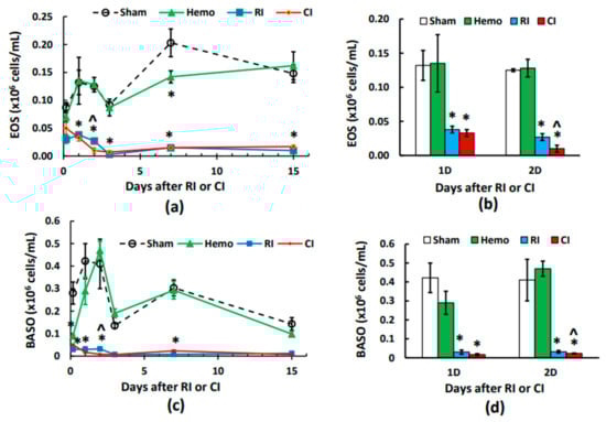 Eosinophils are known to be related to allergy and the suppression of RI-induced small intestinal fibrosis []. The counts for the sham and Hemo groups were indistinguishable, except on day 7, when the eosinophil counts were lower in the Hemo group than in the sham group (Figure 3a,b). The counts recovered on day 15 (Figure 3a). Eosinophil counts were decreased by RI and CI beginning at 4–5 h and through days 1–15 (Figure 3a). On day 2, CI reduced eosinophil counts more than RI (Figure 3b).