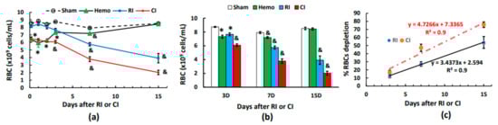 Unlike WBCs, RBCs were reduced at 4–5 h and thereafter on days 1 and 2 post-Hemo. On day 3, RBCs were recovering and back to normal on day 15. The RI-induced RBC depletion began to show on day 3 and continued decreasing on day 15. In contrast to RI, the CI-induced decrease in RBCs appeared at 4–5 h, it was sustained at this low level to day 3, and then it decreased further on days 7 and 15 (Figure 4a,b). Figure 4c shows that CI induced a greater RBC depletion than RI through every time point, as evidenced by the slope of CI (4.7266) versus the slope of RI (3.4373, p < 0.05).
