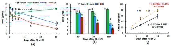 Similar to RBCs, hemoglobin levels were reduced at 4–5 h and thereafter on days 1 to 3 post-Hemo. On day 7, hemoglobin levels were fully recovered and remained normal on day 15. The RI-induced hemoglobin began to show on day 2 and continued decreasing to day 15. In contrast to RI, the CI-induced decrease in hemoglobin appeared at 4–5 h, was sustained at this low level to day 3, and then further decreased on days 7 and 15 (Figure 5a,b). Figure 5c shows that CI induced greater reductions in hemoglobin than RI through every time point, as evidenced by the slope of CI (4.6786) versus the slope of RI (3.7274, p < 0.05).