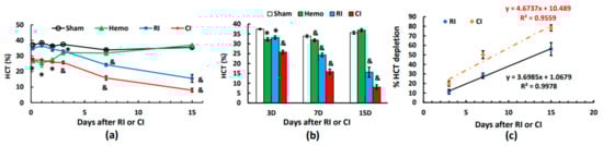 Similar to RBCs and hemoglobin, hematocrit readings were reduced at 4–5 h and thereafter on days 1 to 2 post-Hemo alone. On day 3, hematocrit readings were partially recovered and fully normal on days 7 and 15. The RI-induced hemoglobin drop began to show on day 3 and continued decreasing to day 15. In contrast to RI, the CI-induced decrease in hematocrit readings appeared at 4–5 h, it was sustained at this low reading to day 3, and then it decreased on days 7 and 15 (Figure 6a,b). Figure 6c shows that CI induced a sharper decline in hematocrit readings than RI through every time point, as evidenced by the slope of CI (4.6737) versus the slope of RI (3.6985, p < 0.05).