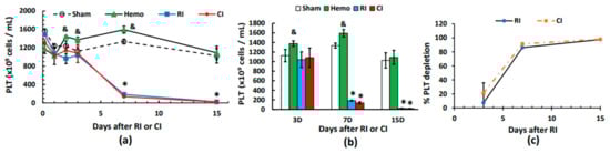 Unlike WBCs and RBCs, platelets were not reduced at 4–5 h or thereafter on day 1 post-Hemo. Hemo increased platelets on days 2, 3, and 7 and returned platelets to the sham level on day 15. RI and CI did not decrease platelet counts until day 7, and these continued to decline on day 15. The decreases driven by either RI or CI were similar (Figure 7a,b) and confirmed by Figure 7c.