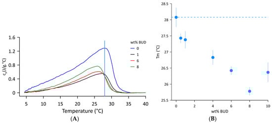 (A) DSC thermograms of the Curosurf® and BUD/Curosurf® mixture. The vertical line indicates the Tm of the Curosurf®. (B) Temperature Tm of the gel-to-fluid phase transition as a function of wt% BUD. The dashed line indicates the Tm of Curosurf®. The error bars represent the standard deviation of duplicate runs of the same sample.