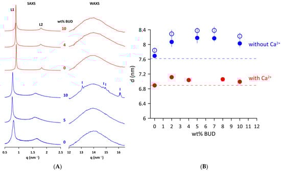 The right panel of Figure 2A displays WAXS patterns of Curosurf® and BUD/Curosurf® mixtures without and with 2 mmol/L of Ca2+. A broad peak at q~14 nm−1 is characteristic of liquid-like ordered lipid acyl chains []. Note that the WAXS pattern of Curosurf® with 10 wt% BUD shows a few sharp small peaks (marked) superposed to a broad peak of liquid-like ordered lipid acyl chains. We identified peaks at q = 13.1, 14.8, 14.9, and 16.2 nm−1, respectively, which are consistent with peaks of the XRD pattern of the powder BUD reported in []. A similar effect was previously observed and reported, for example, for sitosterol in the egg yolk phosphatidylcholine bilayer [] or long-chain alcohols in the mixture of dioleoylphosphatidylethanolamine (DOPE)/dioleoylphosphatidylcholine (DOPC) []. It should be noted that we did not observe a similar effect for BUD/Curosurf® in the presence of Ca2+ (Figure 2A).