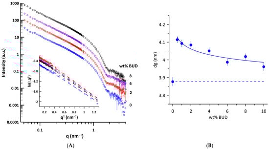We performed small-angle neutron scattering (SANS) experiments on ULVs of Curosurf® and BUD/Curosurf® mixtures to determine the thickness of the lipid bilayer, taking advantage of the contrast between the coherent neutron scattering length densities (NSLDs) of the Curosurf® mixtures and of the solvent (D2O). Figure 3A shows the curves of SANS intensity I(q) vs. q typical of unilamellar vesicles prepared by extrusion. The parameter related to the thickness of the lipid bilayer, dg, was obtained from the value of the radius of gyration, Rg, using Equations (3) and (4) (Materials and Methods). Additionally, dg is a linear function of the trans-bilayer phosphate–phosphate distance (dHH) in unilamellar phosphatidylcholine vesicles []. The Figure 3A inset shows the illustrative dependences of the Kratky–Porod plot, ln(I(q).q2) vs. q2 in the region of 0.31 nm−1 ≤ q ≤ 1.14 nm−1 used for determination of Rg (r2 ≥ 0.993). We determined the thickness of the lipid bilayer dg = 3.88 ± 0.02 nm for Curosurf®. For comparison, dg = 4.03 ± 0.11 nm was found for unilamellar DPPC vesicles at 50 °C, prepared by extrusion []. Figure 3B shows changes in the thickness of the lipid bilayer induced by BUD. Even 0.5 wt% of BUD increases the bilayer thickness by ~0.23 nm and, surprisingly, the effect decreases with the increasing BUD content.