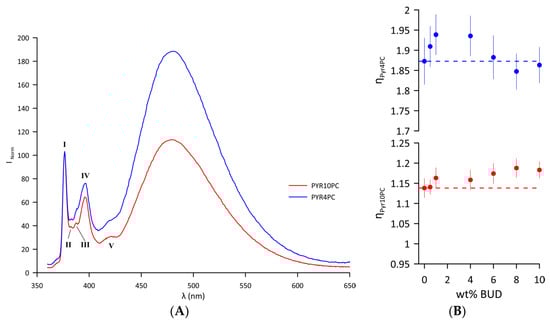 (A) Normalised fluorescence emission spectrum of Pyr4PC and Pyr10PC in Curosurf® bilayers at 37 °C with designated vibronic bands of pyrene monomer (I–V). The spectra are normalised to the intensity of the first monomer maxima, . (B) Lateral pressure detected by Pyr4PC (blue) and Pyr10PC (red) fluorescence probes as a function of wt% BUD at 37 °C. The dashed line corresponds to the ηPyrnPC n = 4 and 10 of Curosurf® without BUD. The error bars represent the standard deviation of the fluorescence intensities measured as a function of time.