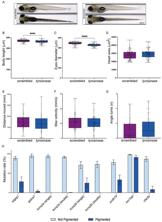 - Kroll, F.; Powell, G.T.; Ghosh, M.; Gestri, G.; Antinucci, P.; Hearn, T.J.; Tunbak, H.; Lim, S.; Dennis, H.W.; Fernandez, J.M.; et al. A Simple and Effective F0 Knockout Method for Rapid Screening of Behaviour and Other Complex Phenotypes. eLife 2021, 10, e59683. [Google Scholar] [CrossRef]