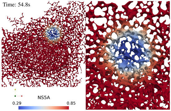 The nonstructural proteins (NSPs) of HCV govern the replication of the HCV genome (viral RNA—vRNA) [27,52]. Directly after their cleavage from the viral polyprotein, which is translated at the ribosomes from the information stored within the vRNA attached to the ribosomes, the NSPs anchor to the ER surface [27,28,30,48,53,54]. Thus, the movement of the NSPs is restricted to the ER surface, which is a 2D curved manifold embedded in 3D. Refs. [43,44,45,46,47] described the evolution of the vRNA cycle by surface partial differential equations (sufPDEs). These equations were evaluated numerically on reconstructed geometry grids describing the ER and membranous web (MW) regions.