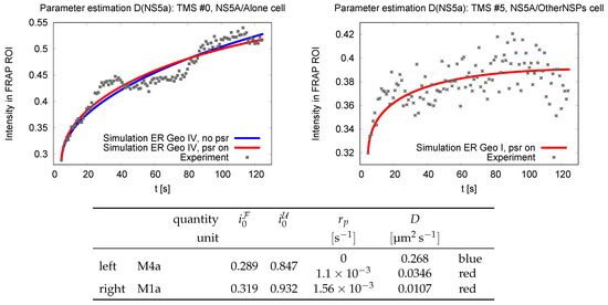 With this precaution, one establishes a straightforward method to determine the diffusion parameters for viral proteins that are attached to the ER surface. Surface diffusivity of NSPs on the ER is an important material parameter that is needed to arrive at quantitative predictions of the rates of the biochemical reaction kinetics of processes located on the ER [53,55,56,65,66]. For instance, we recently adopted the NSP surface diffusion constant derived in the present study in a coupled surface–volume PDE model [50,51]. This allowed us to perform biophysical simulations for the dynamics of the major components of an intracellular virus genome replication cycle which are in quantitative agreement with experimental data [49].