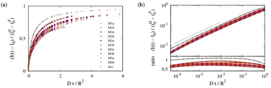 The prediction is tested in Figure 4a. In the late stage of the recovery the recovery is still considerably impacted by the ER geometry. The curves for different geometries differ by up to 25%. However, for the data at the outset the transformation from a time scale to provides a very nice data collapse for the ER geometries. For a perfect fit, the ratio of the data to must be one. For our simulations, it takes a value close to . We attribute this difference to the impact of the nontrivial curvature of the border of : the solution Equation (7) applies when the normal direction at the interface of does not change when moving along the interface. This holds for a straight line in a plane and for a vertical section through a cylinder. For the surface of the disks, this condition is always violated, such that the prefactor takes a value substantially larger than one. For the surface of , it applies to a good approximation at some place. Hence, the prefactor takes a value closer to one than that for a disk.