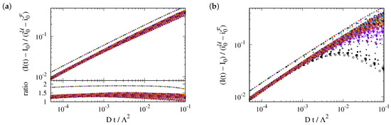 Data collapse for the reduced density as a function of the dimensionless time . Different colors refer to different values of D, which take values in . The symbols refer to different geometries, as specified in the legend, and discussed in Section 4. (a) Simulation data with a linear scale. There are different curves for each geometry, but for any given geometry, data with different D collapse on a single line. (b) The upper panel provides a double-logarithmic plot of the data shown in (a). The lower panel shows the ratio of the data and . To a good approximation, it is a horizontal line. Hence, the data follow a power law with the exponent , where the ratio provides the prefactor of the power law. For the planar geometry, the prefactor takes a value slightly larger than one. For bicontinuous structures, it differs for each geometry, with values in the range between and .
