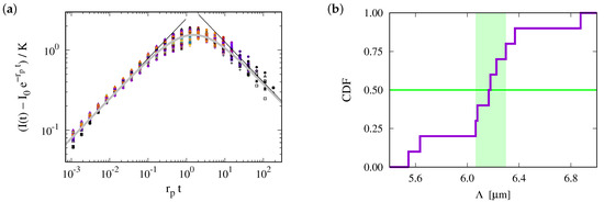 (a) The collapse of all data on the master curve predicted by Equation (11). There is a very good collapse for early times, , and the cross-over due to photobleaching is also accounted for. The two straight gray lines show the functions and , with and , respectively, i.e., the asymptotic power laws derived in Equation (12). The thick solid gray line shows an interpolation, Equation (13), of the asymptotics. (b) The cumulative distribution of the values of . For with a radius of in the presently considered ER geometries, the values of are sharply centered in a narrow interval with a width of (shaded region) around a median of .