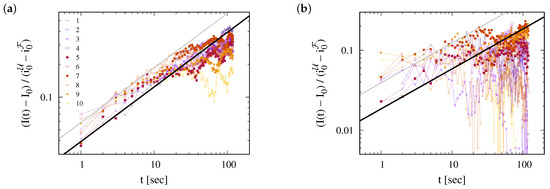 This is in line with the data collapse in Figure 5a, where the data for large lie close to with . Here, a correction term, , of the prefactor is expected since Equation (7) is based on an approximation that applies only to early times. An extrapolation that agrees very well with the observed data is provided by