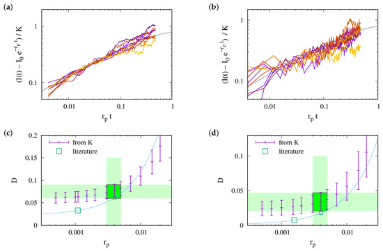 Moreover, in this figure, the estimates suggested in Ref. [45] are shown by large squares. These estimates were obtained, however, for smaller values of because the analysis in Ref. [45] is biased to provide quench rates that are systematically too small. After all, it neglects the diffusion of dye molecules into the test region considered in the estimate of . On the other hand, Equation (A1) and Table A5 of Ref. [45] provide predictions of how the values of the diffusion coefficients change when adopting other values of . It is shown by the solid lines shown in Figure 7c,d. For , we find and for the first and second cell lines, respectively. These values lie on the smaller side but are still within the error margins of the present analysis. They are shown by the small squares.