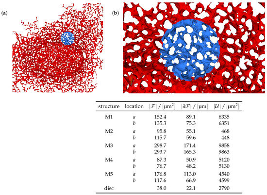 Numerical tests of our theoretical considerations were performed by numerically solving Equation (1) on reconstructions of ER geometries that are fully described in [43,45,46]. An example is provided in Figure 8. The ER [25,61,62] comprises a bicontinuous structure with a characteristic pore diameter of 1 . It has a thickness of a few pore diameters and a lateral extension of about 50 pore diameters in the other two directions. The overall surface area of the membrane comprising the ER is on the order of . We considered five surface geometries, denoted by M1 to M5. For each of them, we considered two distinct locations of the FRAP region of interest. This distinction is marked by a and b, respectively. Hence, for the simulations, we considered ten ER structures in total. Moreover, in order to explore the impact of the bicontinuous structure of the ER, we also performed simulations on a flat disk. This structure is denoted as a disk. The specific values for the structures considered in the present study are provided in the table in Figure 8. Full details concerning the investigated structures and the numerical method are provided in [43,45,46].