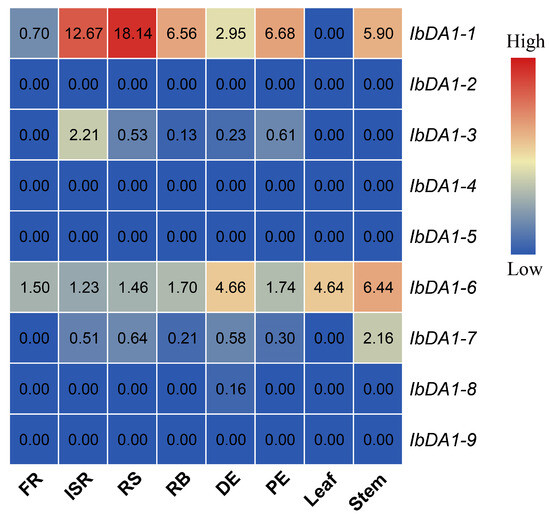 To identify the expression of the DA1 gene in different tissues, we analyzed the published transcriptome data of “Xushu 18”. This was performed to clarify the potential function of the DA1 gene in sweet potatoes. A heat map was created using fragments per kilobase of the exon model per million mapped fragments (FPKM). Usually, a gene’s FPKM value is greater than 1, indicating its expressibility and functionality. In this study, the FPKM of IbDA1-6 in the sweet potatoes was greater than 1 in eight different tissues, indicating that IbDA1-6 is expressible and functional. IbDA1-1 was highly expressed in six tissues but not in the fibrous root (FR) or leaf. The FPKM values of IbDA1-2, -3, -4, -7, -8, and -9 were almost all less than 1 in the eight sweet potato tissues, indicating that they were non-functional (Figure 5).