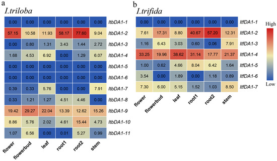 DA1 expression was also investigated in I. trifida and I. triloba based on RNA-seq data collected from six tissues (flowers, flower buds, leaves, root 1, root 2, and stem). In I. triloba, a total of five ItbDA1s were highly expressed in the flowers: ItbDA1-2, -4, -9, -10, and -11. The flower buds expressed high levels of six ItbDA1s (i.e., ItbDA1-2, -4, -8, -9, -10, and -11). In the leaves, ItbDA1-2, -3, -4, -7, -8, -9, and -10 were highly expressed. There were five ItbDA1s (ItbDA1-2, -3, -8, -9, and -10) found at high levels of expression in the roots (root 1 and root 2). In the leaves, six ItbDA1s were highly expressed (ItbDA1-2, -3, -4, -7, -9, and 10). Moreover, three ItbDA1s (i.e., ItbDA1-1, 5, and 6) showed low expression levels in all of the tissues (Figure 6a).
