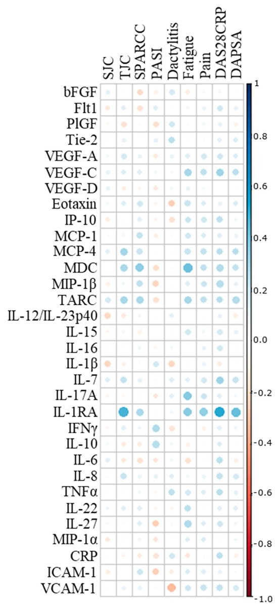 Correlation analysis. Spearman’s correlation coefficient was implemented to assess associations between individual biomarkers and clinical and patient-reported outcomes. SJC, swollen joint count; TJC, tender joint count; SPARCC, Spondyloarthritis Research Consortium of Canada; PASI, Psoriasis Area Severity Index; DAS28CRP, Disease Activity Score calculated with 28 joints and c-reactive protein; DAPSA, disease activity in psoriatic arthritis; bFGF, basic fibroblast growth factor; Flt-1, Fms-related receptor tyrosine kinase-1; PlGF, placental growth factor; Tie-2, endothelial receptor tyrosine kinase; VEGF, vascular endothelial growth factor; IP-10, IFN-induced protein-10; MCP, monocyte chemoattractant protein; MDC, macrophage-derived chemokine; MIP, macrophage inflammatory protein; TARC, thymus and activation-regulated chemokine; IL, interleukin; IL-1RA, interleukin-1 receptor antagonist; IFN, interferon; TNF, tumor necrosis factor; CRP, c-reactive protein; ICAM, intercellular adhesion molecule; VCAM, vascular cell adhesion molecule.