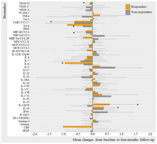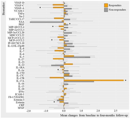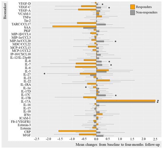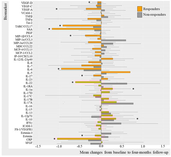 Mean changes in biomarker level in IL-17Ai initiators stratified by DAPSA50. Log-transformed mean changes from baseline to four-month follow-up stratified by DAPSA50 corresponding to a 50% improvement in DAPSA, included as a measure of arthritic joint disease (Table S3). * (star) represents changes that are statistically significant. IL-17Ai, interleukin-17A inhibitor; DAPSA, disease activity in psoriatic arthritis; VEGF, vascular endothelial growth factor; VCAM, vascular cell adhesion molecule; TNF, tumor necrosis factor; Tie-2, endothelial receptor tyrosine kinase; TARC, thymus and activation regulated chemokine; CCL, CC chemokine ligand; SAA, serum amyloid A; PlGF, placental growth factor; MIP, macrophage inflammatory protein; MDC, macrophage-derived chemokine; MCP, monocyte chemoattractant protein; IP-10, IFN-induced protein-10; CXCL, CX chemokine ligand; IL, interleukin; IL-1RA, interleukin-1 receptor antagonist; IFN, interferon; ICAM, intercellular adhesion molecule; Flt-1, Fms-related receptor tyrosine kinase-1; CRP, c-reactive protein; bFGF, basic fibroblast growth factor.