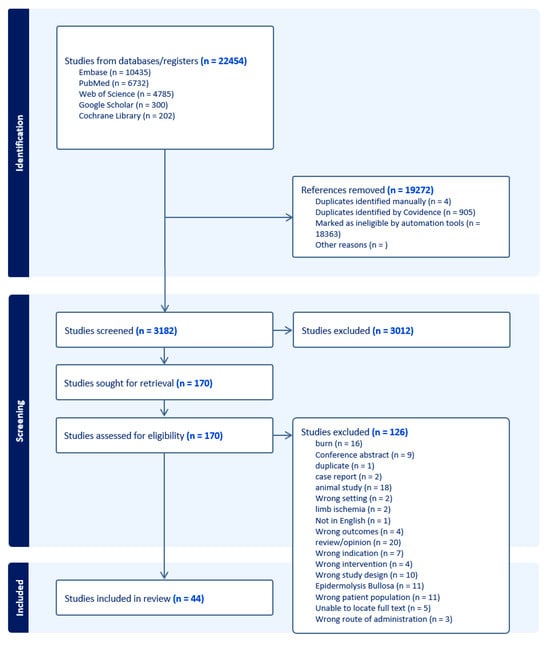 Figure 1 shows the search results as a flow diagram. It shows the initial 22,454 results retrieved from five sources, which were narrowed via deduplication and automation to 3186 articles for title and abstract screening. Upon applying the exclusion and inclusion criteria, 3012 articles were excluded as irrelevant, leaving 170 articles for full-text screening. After reviewing the full-text articles, 126 articles were excluded, leaving 44 included studies. The excluded articles included articles on burn scars; conference abstracts; duplicate papers; case reports; animal studies; studies with the wrong setting (such as stem cell application in scar revision, chronic radiation dermatitis, tissue augmentation), wrong intervention (such as platelet-rich plasma application to chronic wounds or stem cell application to prevent critical limb ischemia), wrong outcomes (outcome scar revisions), wrong patient population (patients with scars, patients who underwent subcision, patients with alopecia), or wrong route of administration (application of fat tissue without any intervention); studies on epidermolysis bullosa; and papers for which we were not able to locate the full-text articles.