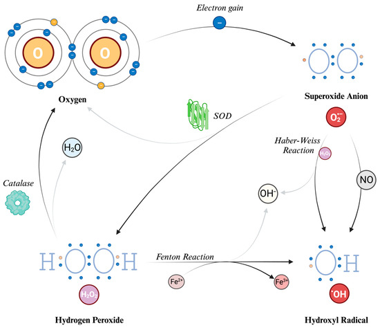 Hydrogen peroxide (H2O2) is generated from O2− through a reaction called dismutation (i.e., a reaction in which the same species is both reduced and oxidized), in which two superoxide molecules are transformed in H2O2 and O2, catalyzed by the enzyme superoxide dismutase (SOD). H2O2 is not a free radical, and therefore it does not directly oxidize other molecules. However, it can move quickly through the cell membranes and, transforming into a potent compound (hydroxyl radical, described further in the text), it can exert the effects of ROS at different sites instead of its production site. Indeed, due to a non-enzymatic reaction that requires iron in its reduced state (Fe2+), known as the Fenton reaction, the most reactive compound known, hydroxyl radical (HO•), can be generated from H2O2. The OH• can also be formed through the reaction between O2− and nitric oxide (NO), and the Haber–Weiss reaction (which can be simplified as O2− + H2O2 → HO• + OH− + O2) [13,38]. Due to its tendency to react quickly with the first available molecule, this radical has a short half-life [36]. To prevent the continuation of the reaction chain, catalases can decompose H2O2 into water and O2, thereby preventing the formation of HO•. Because of this cooperative capability, both SOD and catalase are classified as antioxidants.