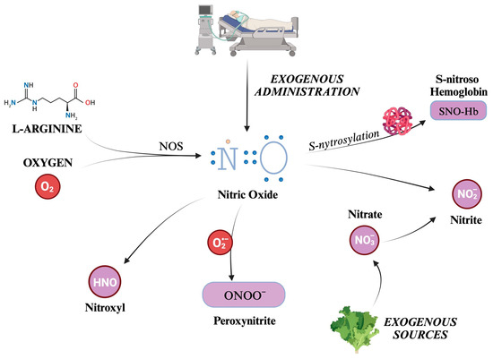 Nitric oxide (NO) is the most well-known and significant member of the RNS family. Also formerly known as endothelium-derived relaxing factor (EDRF), it is constantly generated in the body through the enzymatic action of nitric oxide synthases (NOS) on L-arginine and oxygen. There are three distinct isoforms of NOS present in the body: iNOS (inducible), eNOS (endothelial), and nNOS (neuronal) [58,59]. NOS generates in loco NO, which readily exerts its biological activity. Although its half-life is limited to a few seconds, NO can react with hemoglobin, forming S-nitroso hemoglobin, or be converted to nitrite. S-nitroso hemoglobin (SNO-Hb) is a derivative of hemoglobin modified by adding a NO group to a cysteine thiol group, in a reaction called S-nitrosylation.