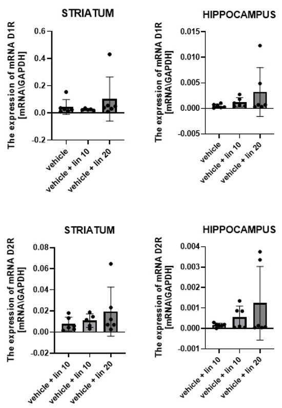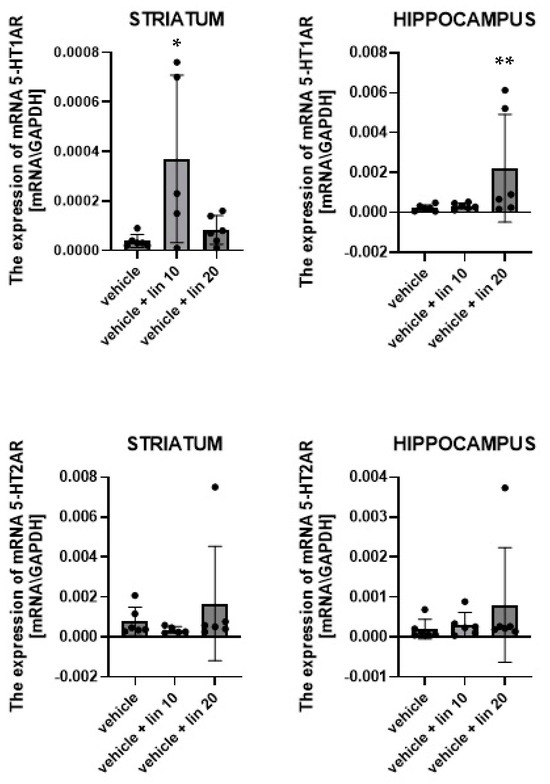 2.2.1. The Effect of Acute Exposure to Linagliptin (10 and 20 mg/kg, i.p.) on mRNA Expression of D1, D2, 5-HT1A, 5-HT2A, α1A and α2A Receptors in the Striatum and Hippocampus in Rats