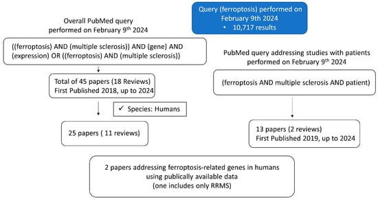 Difficulties in comprehending the pathogenic mechanisms that cause disease progression and many uncertainties about the temporo-spatial occurrence of inflammation and degeneration in MS [12] require further research. Accordingly, ferroptosis draws attention as a biological pathway that could be modulated to achieve reductions in both inflammation and neurodegeneration in the CNS. Quite recently, ferroptosis-related pathways have been found to be upregulated in postmortem brain tissue and linked to neurodegeneration, whereby microglia were determined to be the lead player in ferroptosis-associated events in vitro [5]. Yet, as recommended by the authors of [5], the in vitro models should be complemented with the real state of disease. The experimental data about ferroptosis-related genes and their orchestration in MS patients, which possibly leads to MS progression and/or severity, are scarce. We performed PubMed searches (Figure 1) to estimate the need for further research on MS. The current literature search pointed out that although the understanding of the potential role of ferroptosis in MS is enhanced, a significant gap remains regarding studies in patients with MS.