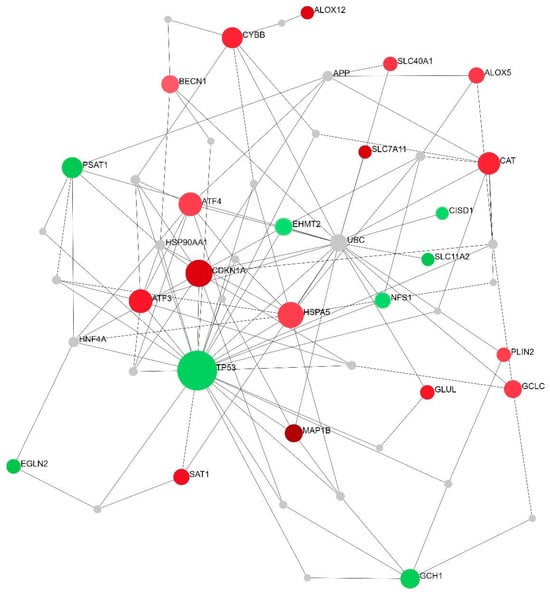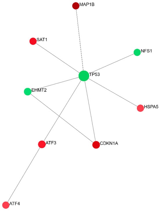 To identify the relationships between all DEGs implicated in ferroptosis-related processes, the NetworkAnalyst 3.0 online platform was applied for generating networks of protein interactions. Of the entire set of DEGs (n = 26), 24 were successfully integrated as seeds of a minimum network containing 51 nodes and 117 interactions (Figure 3). There were two seeds among three nodes with the highest centrality degrees: TP53 with the maximum number of interactions, 28, and CDKN1A with 11 interactions. The enrichment analysis performed on the minimum network confirmed the strong enrichment of the ferroptosis pathway (Table 3). A zero-order network has retained only the direct interactions in the Interactome database (Figure 4). Of the top three DEGs, two were also identified in the zero-order network (CDKN1A and MAP1B), forming an independent axis with a TP53 acting as a hub molecule (Figure 4).