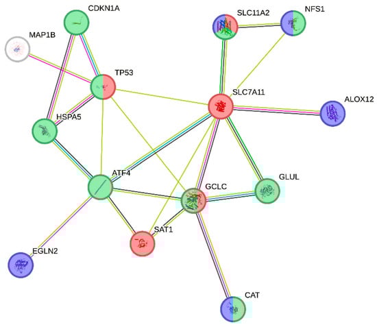 STRING PPI network of ferroptosis-related DEGs between SP and RR MS patients. The STRING v12 database was employed on a set of DEGs passing correction for multiple testing. Colors depict members of the top-enriched annotation terms in the network, computed by the STRING database. Red: ferroptosis (KEGG), Green: catalytic complex (Gene Ontology: Cellular Component), Blue: iron (Annotated key words UniProt). Edges represent protein–protein associations representing joint contributions to a shared function as described on https://string-db.org/.