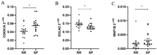 Relative expression of CDKN1A, EGLN2 and MAP1B mRNAs in the replication group of RR and SP MS patients’ PBMCs. Relative mRNA expression is presented as 2−∆Ct values for each sample. The cDNAs from human PBMCs (N = 32) were used to quantify gene expression. The delta Ct value was calculated from the difference between the Ct value of the gene of interest and that of the reference gene, PPIA. Data are presented as 2−∆Ct as mean for both groups (RR-circles and SP-squares) ± SEM. The difference of mRNA relative expression between groups was calculated using a Mann–Whitney U test. (A) Significant upregulation of CDKN1A mRNA was detected in PBMCs from SP patients (N = 16) compared to RR patients (N = 16) (0.05507 ± 0.00565 vs. 0.04182 ± 0.00565, p = 0.04). (B) Significant downregulation of EGLN2 mRNA was detected in PBMCs from SP patients (N = 16) compared to RR patients (N = 16) (0.13020 ± 0.00732 vs. 0.14600 ± 0.00732, p = 0.01). (C) Significant upregulation of MAP1B mRNA was detected in PBMCs from SP patients (N = 16) compared to RR patients (N = 16) (0.00305 ± 0.00087 vs. 0.00175 ± 0.0008, p = 0.04); * p < 0.05.