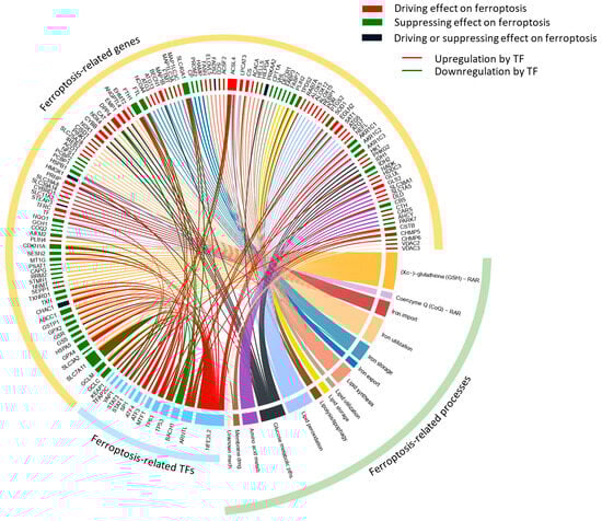 Circos plot of the ferroptosis-related genes selected for RNAseq panel. The Circos plot represents selected ferroptosis-related genes (yellow outer ribbon) with regard to the ferroptosis-related processes (green outer ribbon) and ferroptosis-related transcription factors (blue outer ribbon), which were included in the RNAseq panel. Within the inner circle, gene-associated rectangles are colored according to the proposed effect on ferroptosis: driving effect (red), suppressing effect (green), driving or suppressing (black). Rectangles associated with transcription factors are represented with a blue color. Rectangles associated with ferroptosis-related processes are represented with a unique color clearly distinguishing all of the presented processes. The size of rectangles in the inner circle depicts the number of associations within the Circos plot while the color of the line presents the link of the selected genes with the particular ferroptosis-related processes. Red and green lines depict upregulation and downregulation of selected genes by transcription factors, respectively. The plot was generated according to the data presented in the Supplemental Table S1.