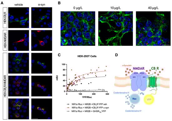 To study the role of the CB1R-NMDAR heteromer in a parkinsonian context, we first determined whether α-syn had any effect on the receptors’ expression localization by performing an immunocytochemical assay in a heterologous expression system. HEK-293T cells expressing either CB1R fused to the fluorescent protein YFP (CB1R-YFP) or the NR1 subunit of NMDAR fused to the bioluminescent protein Renilla luciferase (NR1-Rluc) plus the NR2 subunit of NMDAR were treated with 10 μg/L of human alpha-synuclein (α-syn) fibrils or vehicle for 48 h. NMDAR was detected by an anti-Rluc primary antibody plus a secondary antibody labeled with Cy3. CB1R was detected by reading YFP’s own fluorescence. In the absence of α-syn fibrils, cells expressing only CB1R or NMDAR showed receptor localizations at the cell membrane level (Figure 1A). When cells co-expressed both receptors, the co-localization of CB1R and NMDAR was detected at the plasma membrane (Figure 1A), as previously described []. The presence of α-syn was detected by immunocytochemistry with an anti-human alpha synuclein antibody. Compared to the cells treated with the vehicle that show no signal (Figure 1B), the treated cells showed small red dots, demonstrating that HEK-293T cells are able to incorporate α-syn fibrils. When HEK-293T cells were pre-treated with the α-syn fibrils, neither the localization of CB1R and NMDAR nor their co-localization at the plasma membrane was affected (Figure 1A).