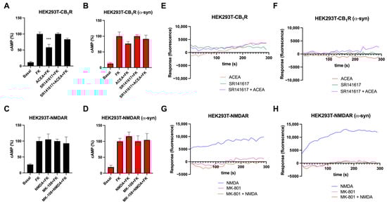 Then, we studied the functionality of the CB1R-NMDAR heteromer in the presence of α-syn fibrils. When HEK-293T cells expressing CB1R and NMDAR were stimulated with forskolin and were treated with the selective CB1R agonist, ACEA, a decrease in cAMP levels (around 30%) was observed. However, treatment with NMDA was not able to modify cAMP levels (Figure 3A). When cells were co-treated with ACEA and NMDA, a decrease in cAMP levels similar to those obtained with ACEA treatment alone was observed, indicating that NMDAR activation does not affect CB1R signaling (Figure 3A). When the cells were pre-treated with antagonists, the CB1R-induced signal was blocked not only by rimonabant but also by the NMDAR antagonist MK-801 (Figure 3A). This phenomenon is known as cross-antagonism and was previously described in this heteromer by Navarro et al. []. Surprisingly, when this assay was performed in the presence of α-syn fibrils, ACEA was not able to diminish cAMP levels (Figure 3B).