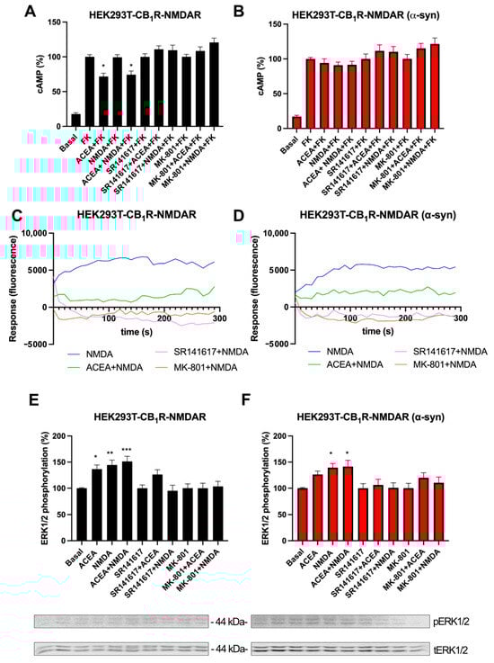 Functional analysis of CB1R-NMDAR complexes in a heterologous system upon α-syn treatment. (A,B) HEK-293T cells were transfected with the cDNAs for CB1R (0.5 µg), NR1 (1 µg), and NR2B (1 µg) and treated (B) or not (A) with α-syn fibrils. Cells were activated with the selective antagonists (1 µM SR141617 for CB1R or 1 µM MK-801 for NMDAR), followed by agonist stimulation (100 nM ACEA for CB1R and/or 15 µM NMDA for NMDAR). cAMP accumulation was detected by HTRF in the presence of 0.5 µM forskolin. (C,D) Calcium release was evaluated in HEK-293T cells transfected with the cDNAs for CB1R (0.75 µg), NR1 (0.75 µg) NR2B (0.75 µg), and 6GCamMP calcium sensor (0.75 µg) and treated (D) or not (C) with α-syn fibrils. Cells were activated with the selective antagonists, followed by agonist stimulation. (E,F) HEK-293T cells were transfected with the cDNAs for CB1R (0.5 µg), NR1 (1 µg), and NR2B (1 µg) and treated (F) or not (E) with α-syn fibrils. Cells were activated with the selective antagonists (1 µM SR141617 for CB1R or 1 µM MK-801 for NMDAR), followed by agonist stimulation (100 nM ACEA for CB1R and/or 15 µM NMDA for NMDAR), and MAPK phosphorylation was detected by Western blot (blots for phosphorylated and total ERK1/2 (42–44 kDa) are shown below). Data represent the mean ± SEM of six-to-eight different experiments performed in triplicates. One-way ANOVA and Tukey’s multiple comparison post hoc test were used for statistical analysis (* p < 0.05, ** p < 0.01, and *** p < 0.001; versus forskolin in cAMP or versus basal in MAPK).